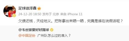 媒體人“足球徐澤鑫”寫道:“欠債還錢,天經(jīng)地義。把賬拿出來(lái)曬一曬,究竟是誰(shuí)在說(shuō)假話呢?”